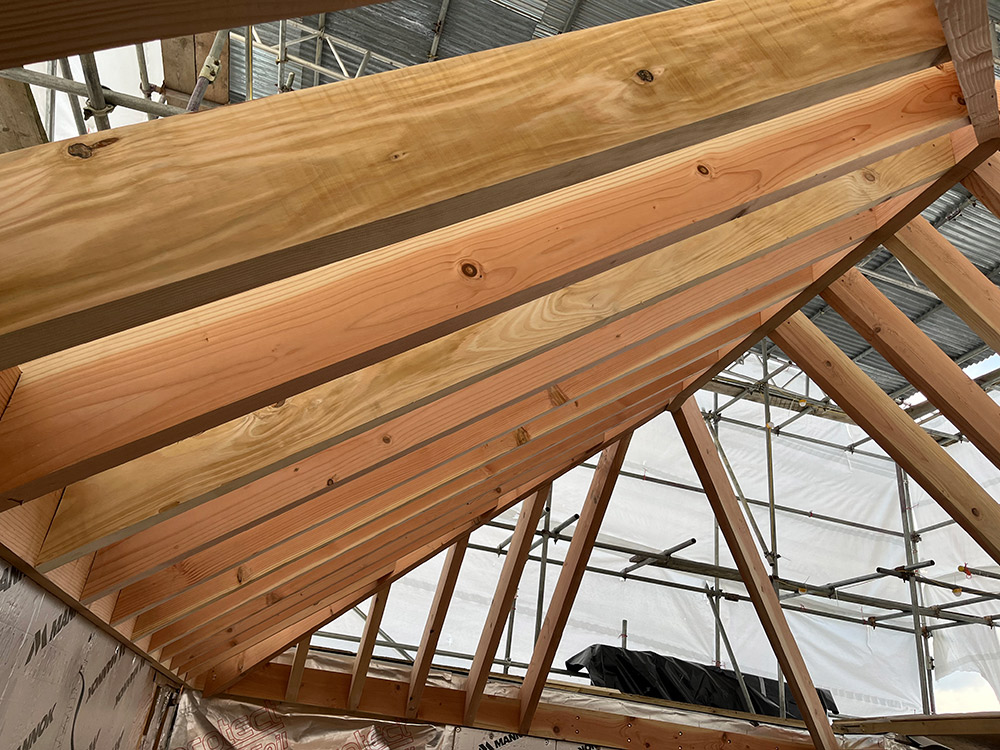 The compound mitres needed honing with hand tools because of the size of the joists. The visible ring beam has been fixed with a countersunk and a bolted method to the internal framework of the building. These have been carefully located behind each of the roof supporting rafters. Each rafter has been fixed with another counter sink fixing which is completed with a glued in pellet and sanded flush to complete on hiding the screw fixings. This assembly took time, thoughtfulness and skill.