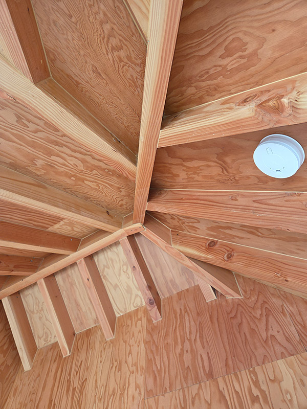 The ironmongery includes the use of concealed joist hangers with steel pegs, which needed mortising carefully with a chainsaw into the 9 X 3-inch joists.