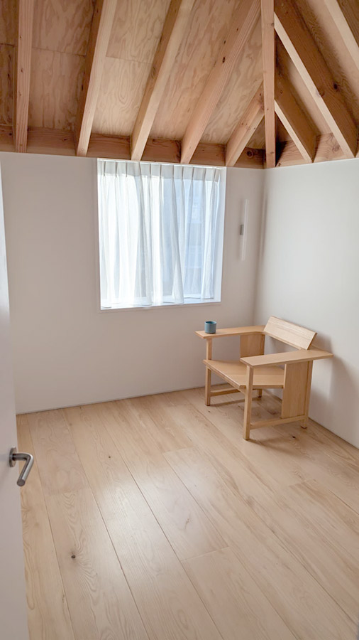 The walls of the landing and bedrooms continue the theme of soft white offset by the warm wood ceiling, the tall white doors are hinged with concealed Tectus hinges and framed by shadow gaps. The rooms are subtly lit by the warm tungsten hues of the lights in the rafters and small tubes and spotlights pointing upwards on the walls continues the sense of warmth and calm at night.