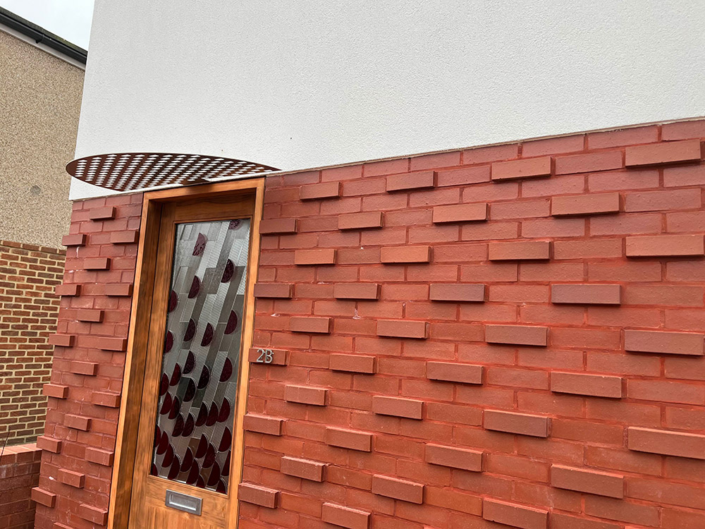The architect has incorporated two motifs as part of the fabric of the Wade House; a quadrant and semi circle. A few examples are the bespoke garden gate, door canopy and stained glass , the semi circular lawn design and the offset red bricks.