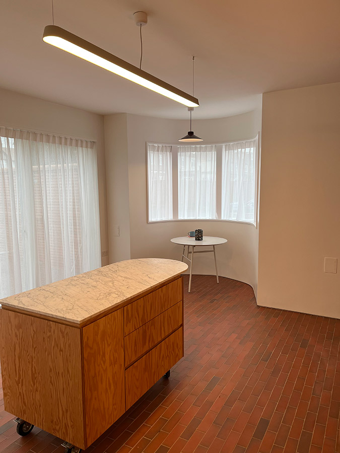This bonded stained glass with a modern twist, nods to the leaded glass from the original 1930s Manor estate, casting shapes onto the warm Kettley red tiles on the entrance hall floor. These tiles flow throughout downstairs, warmed by the underfloor heating adding texture and tone underfoot.