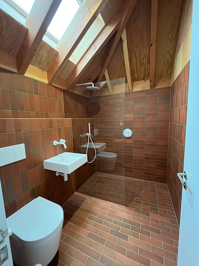 Directly ahead lies the bathroom/wet room with three quarter wall lined red/brown Kettley pavers combining with white Lusso Stone sink, toilet and rain shower with extension arm hand and bespoke glass shower screen.