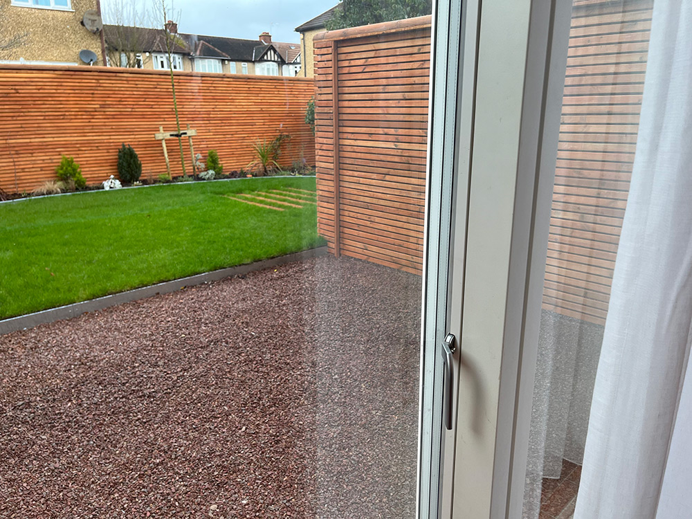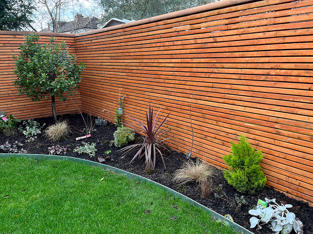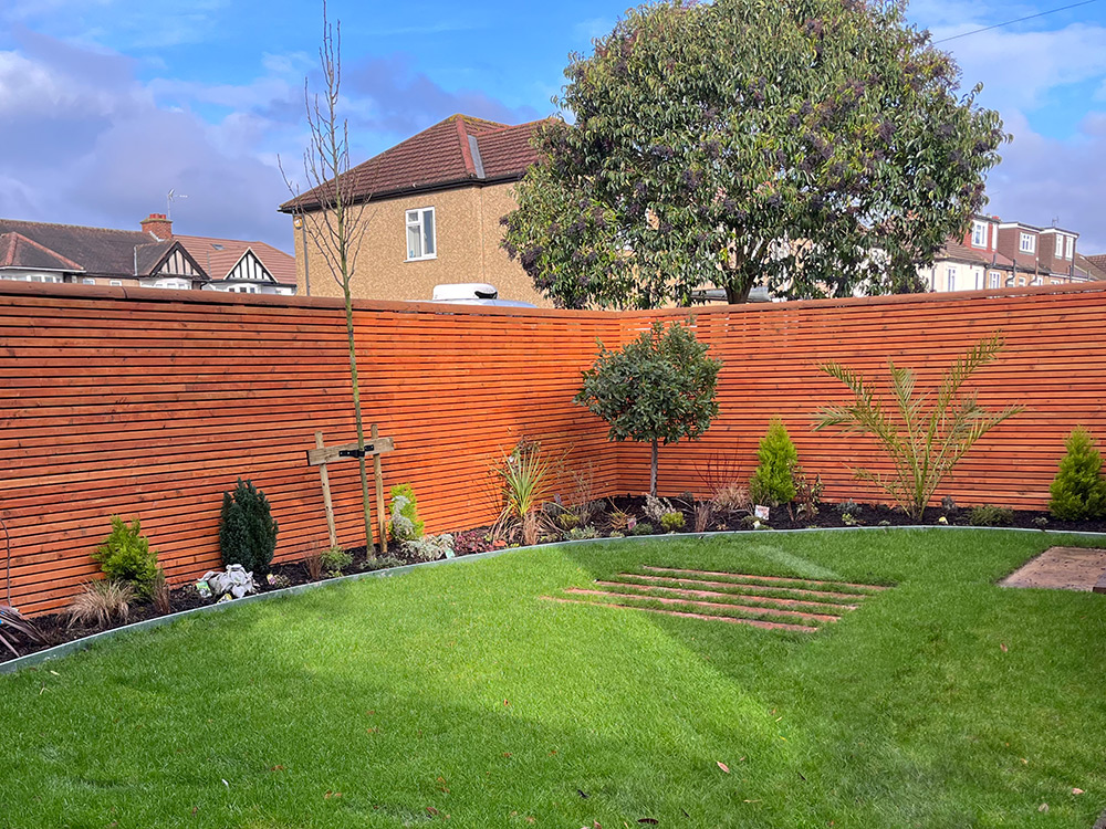 Larch wood fencing and double gates form the garden boundary whilst a bespoke metal garden gate leads the way to a hand made Accoya wood three quarter glass front door with stained glass.