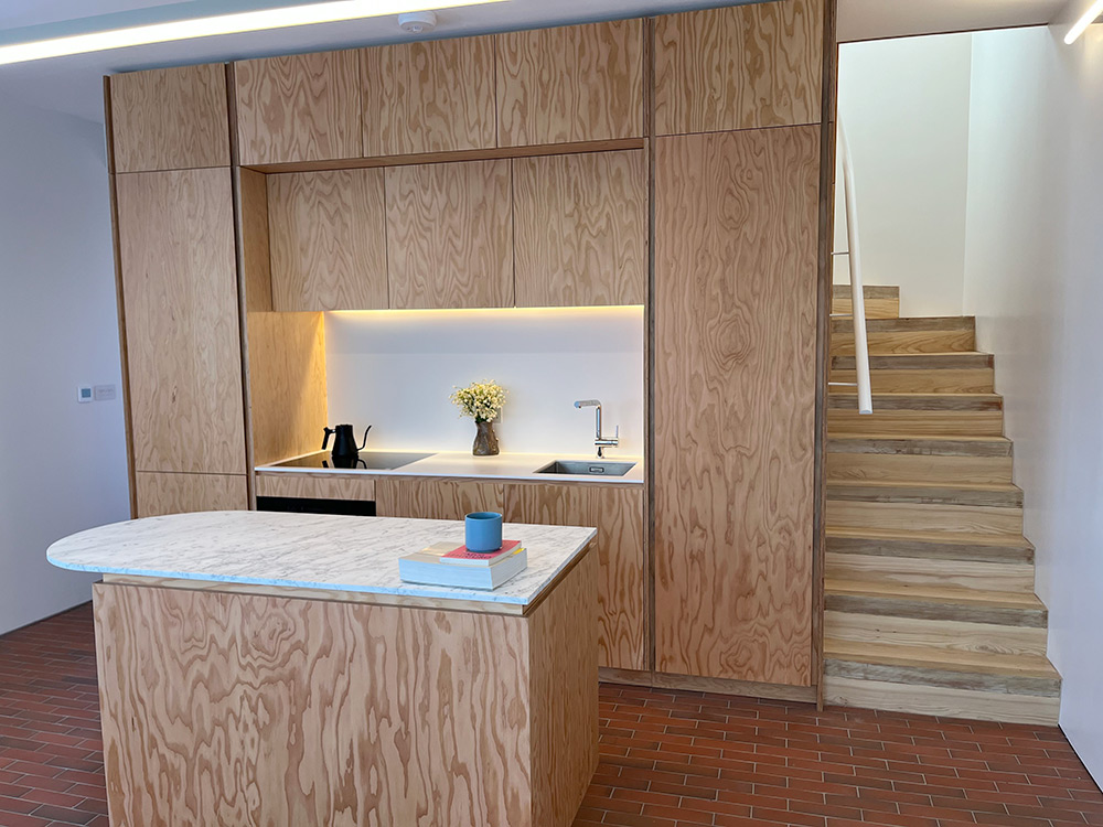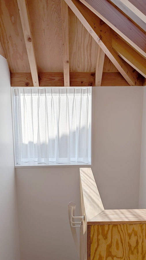 The large picture window drenches the landing in light alongside two Velux windows set into roof creating individual freeze frames of an ever-changing sky. The architect has utilized the available to space with a small bench seat, storage and built-in laundry area with Miele washer/dryer installed, all bespoke hand made by Jacob Alexander.