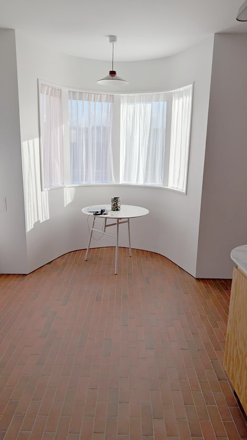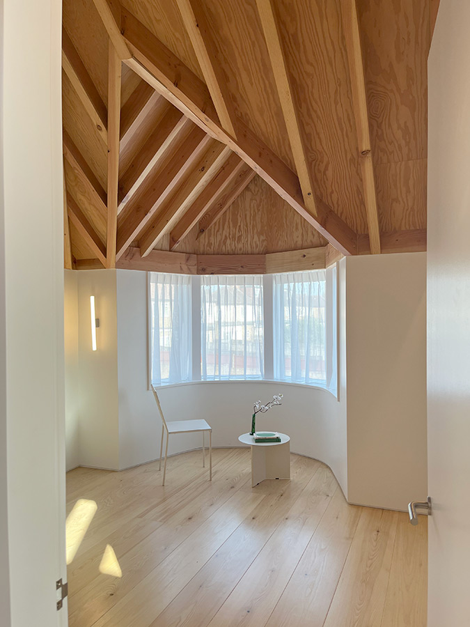 Large bay window with frameless glass captures the view and soft white plastered patina walls creates a spacious and light feeling.